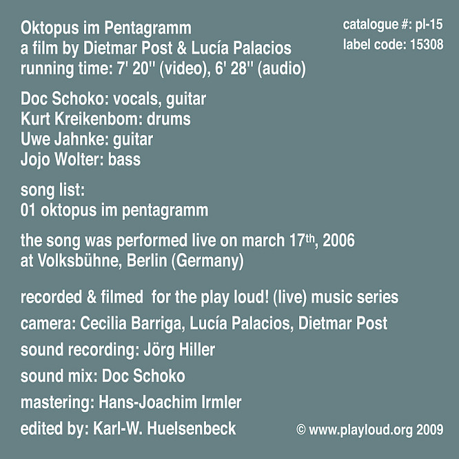 "Doc Schoko: Oktopus im Pentagramm" is the title of the second film within the "play loud! (live) music series". It features the Berlin-based rock 'n' roll band Doc Schoko. The band performs "Oktopus im Pentagramm" at Volksbühne Berlin in 2007. Filmmakers Dietmar Post and Lucia Palacios captured the group in the style of Direct Cinema. About Doc Schoko: First songs at the age of 11. First DIY releases on MC in Germany's most industrialized and populated state of North-Rhine Westphalia (Ruhr Area). A working class punk rocker who uses the German language; just like his German idols, such as, S.Y.P.H., Fehlfarben, Kolossale Jugend, Die Regierung, Ton Steine Scherben, Mutter, Neu! and Blumfeld. No hipster bohemian attitude but down to earth Germaness and a deep understanding of stark and primitive NEU!KRAUT ROCK. Mark E. Smith (The Fall) invited Doc Schoko to be his supporting act.
