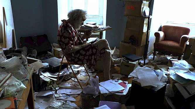 The camera tracks down the details in the room. I don't really trust his work methods -- little gets done -- but they drew me in, affecting my own method in this film. Filmmaker and subject play their cat-and-mouse game.