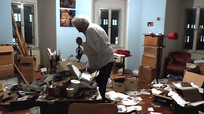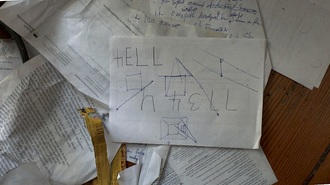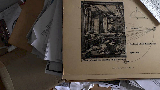 Papers cover the floor, mixed up - a lot of contradictory details. In between noted thoughts, mathematical formulas, graphic sketches, and receipts, there are novels, scientific books, issues of the New York Review, tools, lenses, pieces of wood, cardboards, plastic bags, and dust..