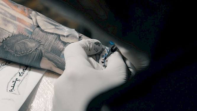 The studio is open to everyone, regardless of nationality, religion or the color of skin. The conversations, which take place under painful circumstances, often resemble confessions, the customers offer intimate insights into their lives in this controversial city, their beliefs and their fears in this continuous conflict which makes up their everyday lives. There are moments when Poko and Daniel are almost like psychologists and artists at the same time. To escape the constant sound of the needle, they take us to special places in the city, to the sea in Tel Aviv and on big Harleys into the mountains surrounding Jerusalem.