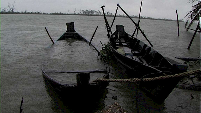 At a leisurely pace, the images speak for themselves: a wilderness of water and greenery that would be paradisiacal if not for the ravage of fallen trees, blown-away huts, and collapsed houses. People talk about the loved ones they lost: one man could no longer hold onto his wife and child and watched them get swept away by the water. There is hardly any rice or drinking water, but people are building new huts all over the place. From this badly stricken area, the filmmakers head to a city where there are many refugees, and then return to the delta with people who prefer their decimated village to a new, unknown place of refuge. Monks attempt to lend a hand and lead a prayer for the dead.