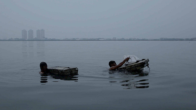 The sea nomads of Indonesia believe that every newborn child has a twin brother in the form of an octopus. Various rituals are carried out in order to live in peace with the twin and prevent misfortune. According to myth, if something terrible does happen, it is said to be the octopus taking apocalyptic revenge. It’s similar in reality: The apocalypse comes in the form of a new artificial world about to be constructed on the water. This immediately threatens the livelihood of the sea nomads. What should they do now? The octopi, with more than 100 different varieties, belong to the largest species of octopus, and are extremely adaptable. But all forms of adaptation ultimately reach their limit when the required space is gone. Documentary filmmaker Florian Kunert made a hybrid film. Subjective shots, interviews, observations and interventions fused into a journey of creature and human, beneath and above the water.