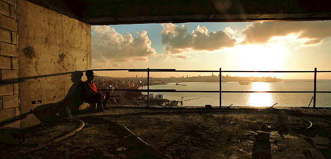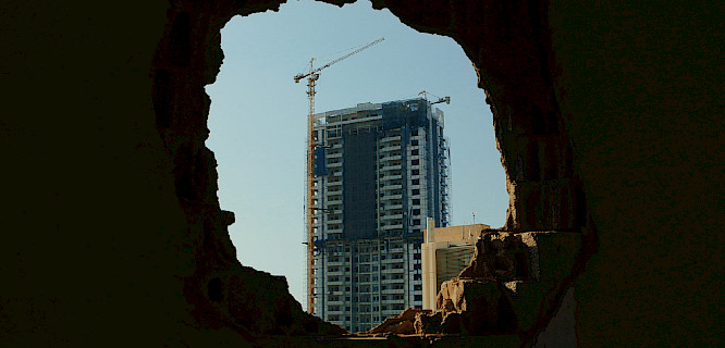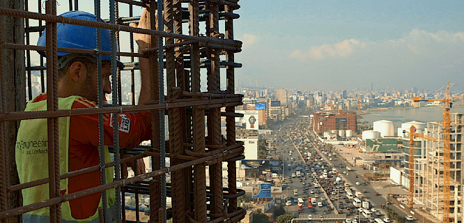 In Beirut, Syrian construction workers are building a skyscraper while at the same time their own houses at home are being shelled. The Lebanese war is over but the Syrian one still rages on. The workers are locked in the building site. They are not allowed to leave it after 19.00 hrs. The Lebanese government has imposed night-time curfews on the refugees. The only contact with the outside world for these Syrian workers is the hole through which they climb out in the morning to begin a new day of work. Cut off from their homeland, they gather at night around a small TV set to get the news from Syria.