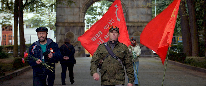 This film documents the proceedings from early morning, when a small group of visitors enter with their dogs, pulling a little wagon carrying a portrait of Stalin, to the evening, after the last patriotic songs have been sung, the selfies with flags sent, the vodka drunk and the speeches have faded away. The camera is always in the thick of the action, both inspired and propelled by an atmosphere that is a mixture of pride and reflection, patriotism and a desire for recognition, shame and typical Berlin curiosity. The spectator becomes aware of just how choreographed each of the actions here are, whether performed by young or old, women in traditional costumes or men in uniform: on this date the memorial reveals its power as a cinematographic magnet, revealing how, even 72 years after the end of the war, an infinite number of lifelines intersect and are defined from exactly this spot, stretching out over Berlin and far beyond." (68th Berlinale)