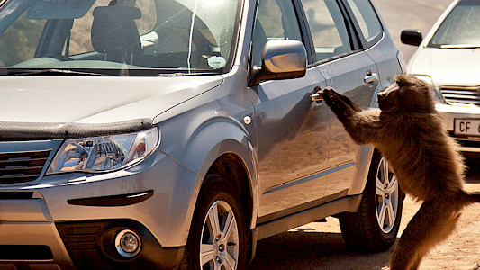 They steal handbags, open cars and have no respect for humans. The last baboons of the Table Mountain region have become a real plague. The resident population is split into sympathetic protectors and fierce opponents. The animals are deliberately run over by cars, shot and poisoned. According to scientists the baboons have to relearn that humans are a threat in order to survive. Thus a special force has been recruited from the townships: the „Baboon Police“. Day and night the „officers“ follow the marauding baboon troops trying to chase away the monkeys with slingshots, sticks and whips. The documentary follows the „Baboon Police“ and their marauding monkey clans. Is there still a chance for humans and baboons to live in peaceful neighbourhood?
