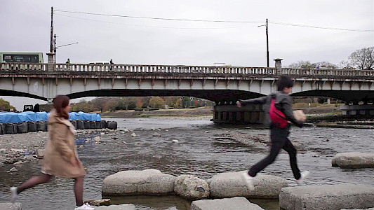 „Kamogawa“ is a composition of scenes of peaceful life along an autumnal river, orchestrated by the sounds of rattling trains, traditional musical instruments and looms, and the fragile voice of an elderly opera singer. It's a place where time seems to have stood still, yet subtly conveys a sense of unease. The film concludes with a train ride through modern Kyoto and a Rückenfigur by a large lake.